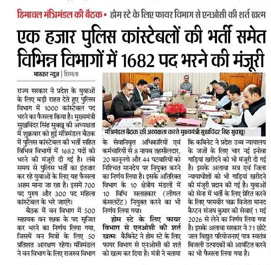 ЁЯЪи рдмреНрд░реЗрдХрд┐рдВрдЧ рдиреНрдпреВрдЬрд╝: рд╣рд┐рдорд╛рдЪрд▓ рдкреНрд░рджреЗрд╢ рдХреЗ рдмреЗрд░реЛрдЬрдЧрд╛рд░ рдпреБрд╡рд╛рдУрдВ рдХреЗ рд▓рд┐рдП рдмрдбрд╝реА рдЦреБрд╢рдЦрдмрд░реА! рдореБрдЦреНрдпрдордВрддреНрд░реА рд╕реБрдЦрд╡рд┐рдВрджрд░ рд╕рд┐рдВрд╣ рд╕реБрдХреНрдЦреВ рдХреА рдЕрдзреНрдпрдХреНрд╖рддрд╛ рдореЗрдВ рд╣реБрдИ рдХреИрдмрд┐рдиреЗрдЯ рдмреИрдардХ рдореЗрдВ 1682 рдкрджреЛрдВ рдкрд░ рднрд░реНрддреА рдХреЛ рд╣рд░реА рдЭрдВрдбреА рджреЗ рджреА рдЧрдИ рд╣реИред рдЗрд╕рдореЗрдВ 1000 Police Constable + 500 Forest Guard + 182 рдЕрдиреНрдп рдкрдж рд╢рд╛рдорд┐рд▓ рд╣реИрдВред рдЕрдЧрд░ рдЖрдкрдиреЗ рд╕рд░рдХрд╛рд░реА рдиреМрдХрд░реА рдХрд╛ рд╕рдкрдирд╛ рджреЗрдЦрд╛ рд╣реИ рддреЛ рдпрд╣ рд╕реБрдирд╣рд░рд╛ рдореМрдХрд╛ рдмрд┐рд▓реНрдХреБрд▓ рдордд рдЧрдВрд╡рд╛рдЗрдП!