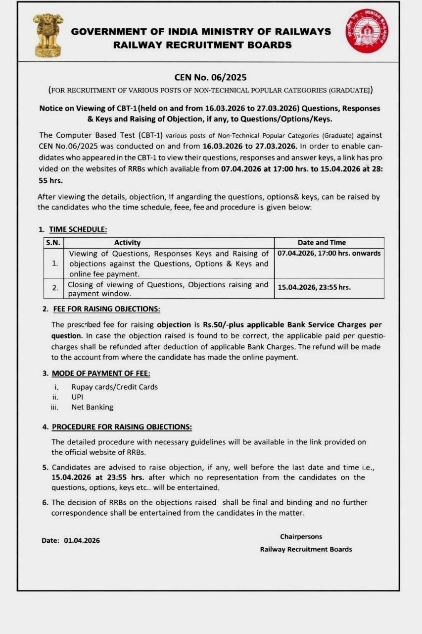 рд░реЗрд▓рд╡реЗ рдмреЛрд░реНрдб рдиреЗ рдЖрдзрд┐рдХрд╛рд░рд┐рдХ рдиреЛрдЯрд┐рд╕ (01.04.2026) рдЬрд╛рд░реА рдХрд░ рджрд┐рдпрд╛ рд╣реИ рдЬрд┐рд╕рдХреЗ рдЕрдиреБрд╕рд╛рд░ рдЙрдореНрдореАрджрд╡рд╛рд░ 07 рдЕрдкреНрд░реИрд▓ 2026 (рд╢рд╛рдо 5:00 рдмрдЬреЗ) рд╕реЗ рдЕрдкрдиреА Answer Key, Question Paper рдФрд░ Response Sheet рджреЗрдЦ рд╕рдХрддреЗ рд╣реИрдВред рдпрджрд┐ рдЖрдкрдХреЛ рд░реЗрд▓рд╡реЗ рджреНрд╡рд╛рд░рд╛ рджрд┐рдП рдЧрдП рдХрд┐рд╕реА рдЙрддреНрддрд░ рдкрд░ рд╕рдВрджреЗрд╣ рд╣реИ, рддреЛ рдЖрдк рдкреНрд░рддрд┐ рдкреНрд░рд╢реНрди тВ╣50 рдХрд╛ рд╢реБрд▓реНрдХ рджреЗрдХрд░ рдЕрдкрдиреА рдЖрдкрддреНрддрд┐ (Objection) рджрд░реНрдЬ рдХрд░рд╛ рд╕рдХрддреЗ рд╣реИрдВред рд╕рдВрдкреВрд░реНрдг рднрд░реНрддреА (Vacancy), рдЪрдпрди рдкреНрд░рдХреНрд░рд┐рдпрд╛, рдХрдЯ-рдСрдл рдФрд░ рдЖрдкрддреНрддрд┐ рджрд░реНрдЬ рдХрд░рдиреЗ рдХрд╛ рд╕реАрдзрд╛ рд▓рд┐рдВрдХ рдиреАрдЪреЗ рджрд┐рдпрд╛ рдЧрдпрд╛ рд╣реИред