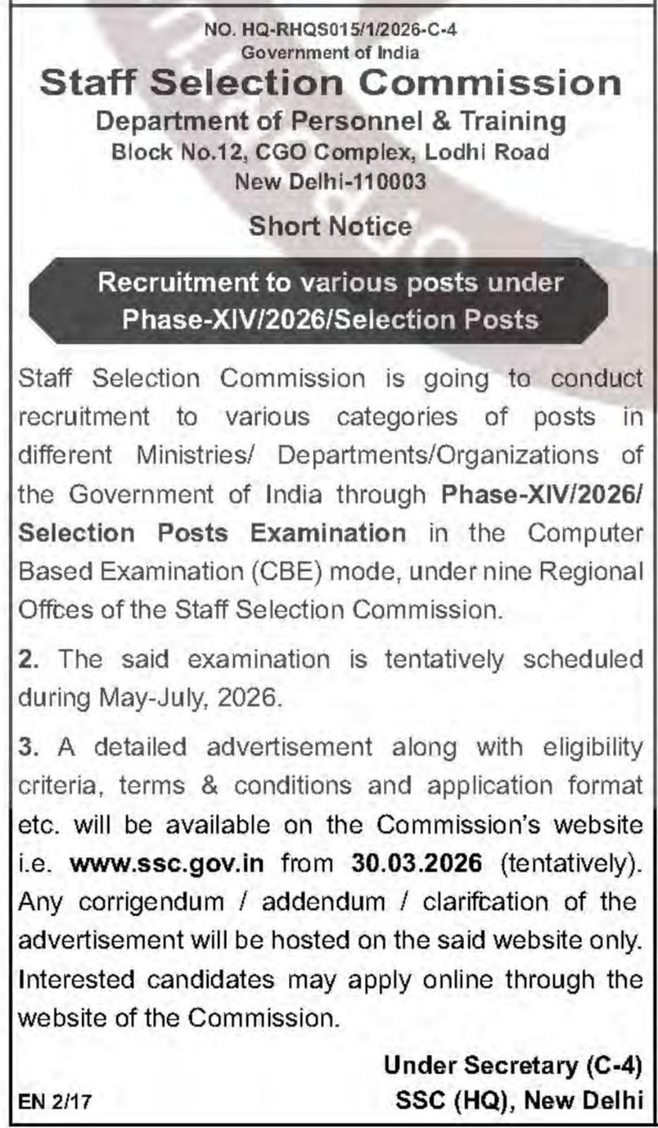 SSC Phase 14 का इंतजार खत्म! Staff Selection Commission (SSC) ने 13 अप्रैल 2026 को Phase-XIV/2026/Selection Posts का आधिकारिक विस्तृत नोटिफिकेशन (Detailed Notification) जारी कर दिया है। इस भर्ती में कुल 3003 पदों पर भर्ती की जाएगी जो 10वीं, 12वीं और ग्रेजुएट — तीनों स्तर के उम्मीदवारों के लिए एक शानदार मौका है।